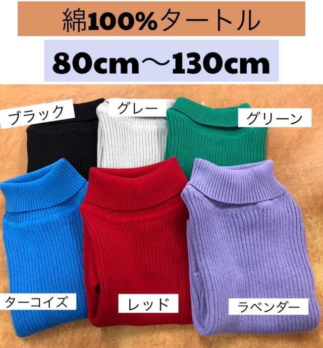 【綿100%】 綿100%のハイネックタートルです。 綿100%なので、首元もチクチクしません。 サイズ展開は、80cm〜130cmまで。 小さなお子様でも嫌がらずに着ていただけるタートルです。 豊富なカラー展開で、兄弟姉妹でお揃いも可能! 素材 綿 100% ※店頭と在庫を共有しています。店頭で売れるのとタイミングが重なって売り切れてしまう場合がございます。ご容赦ください。