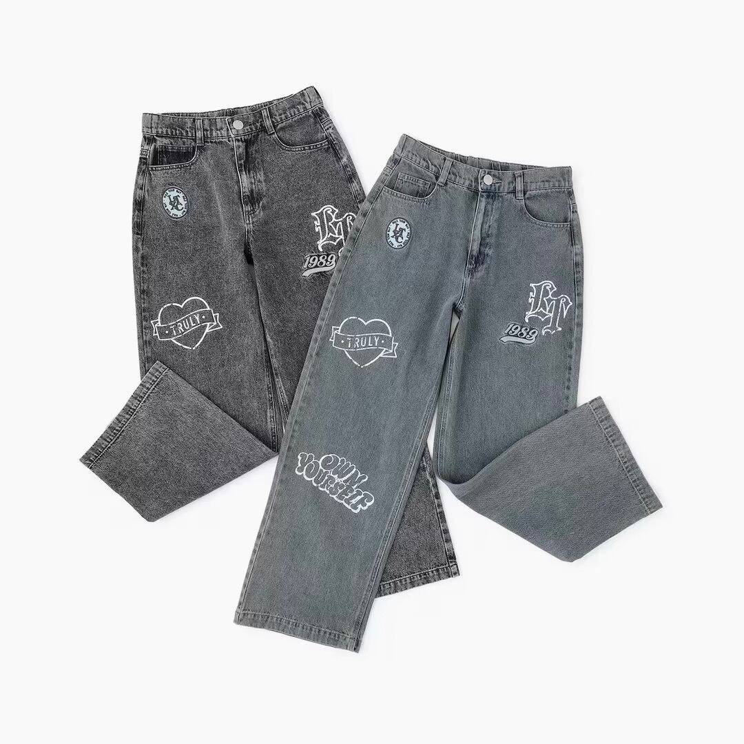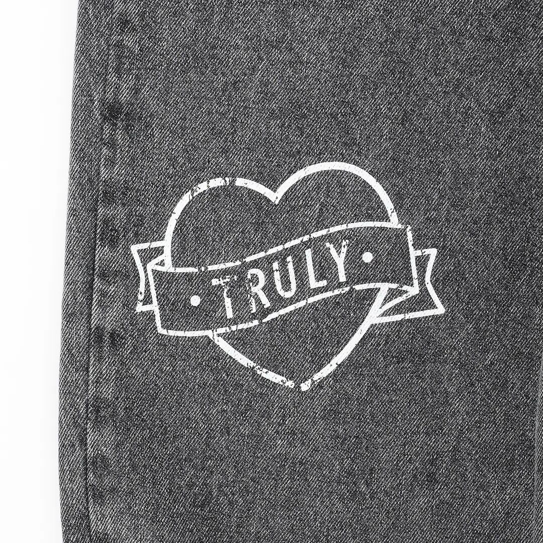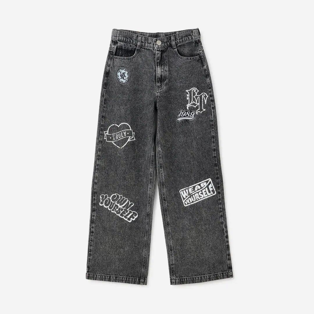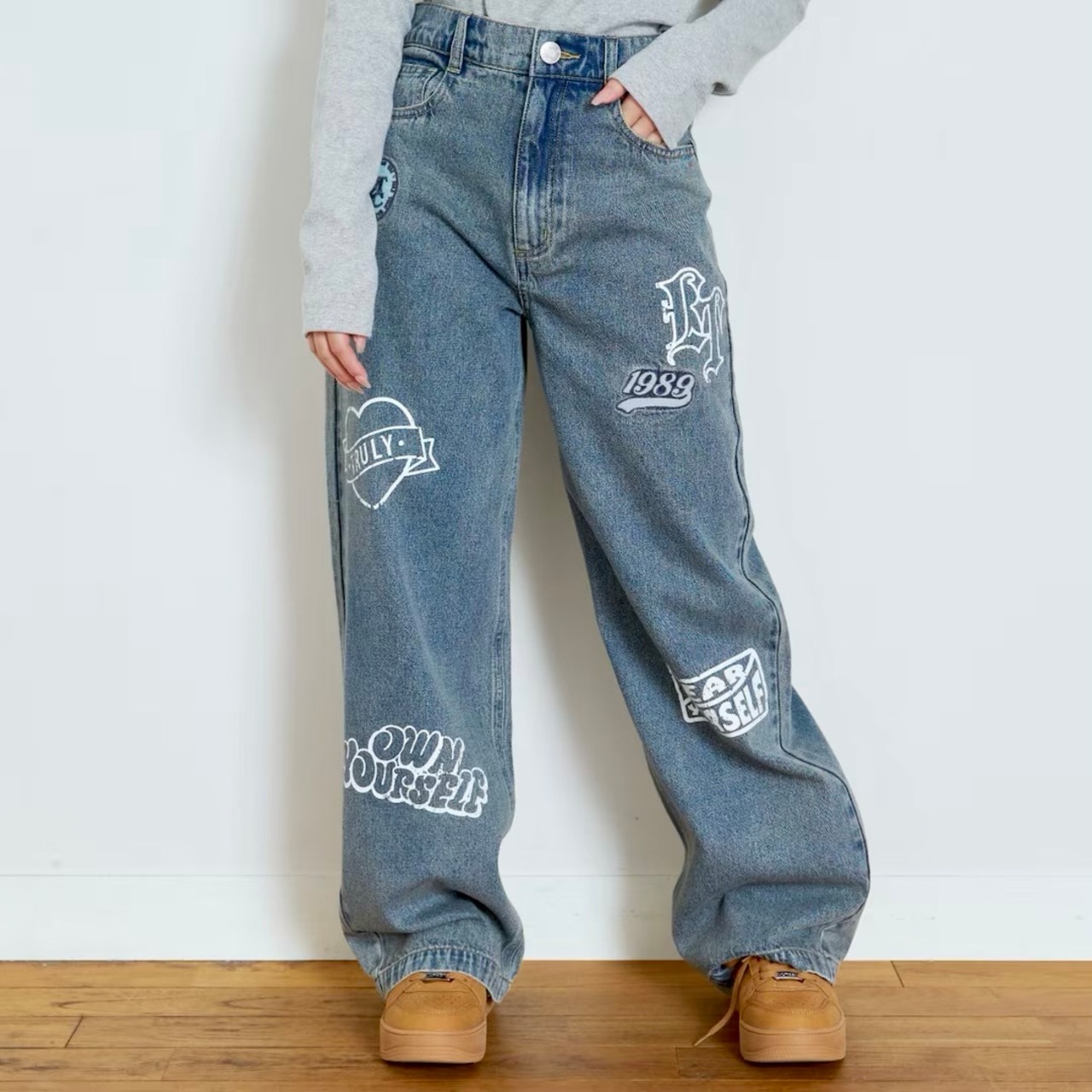 ポジティブなフレーズとハートなどのワクワクするモチーフがポイント! 掠れプリントやワッペンを加えたストリートデザインです。