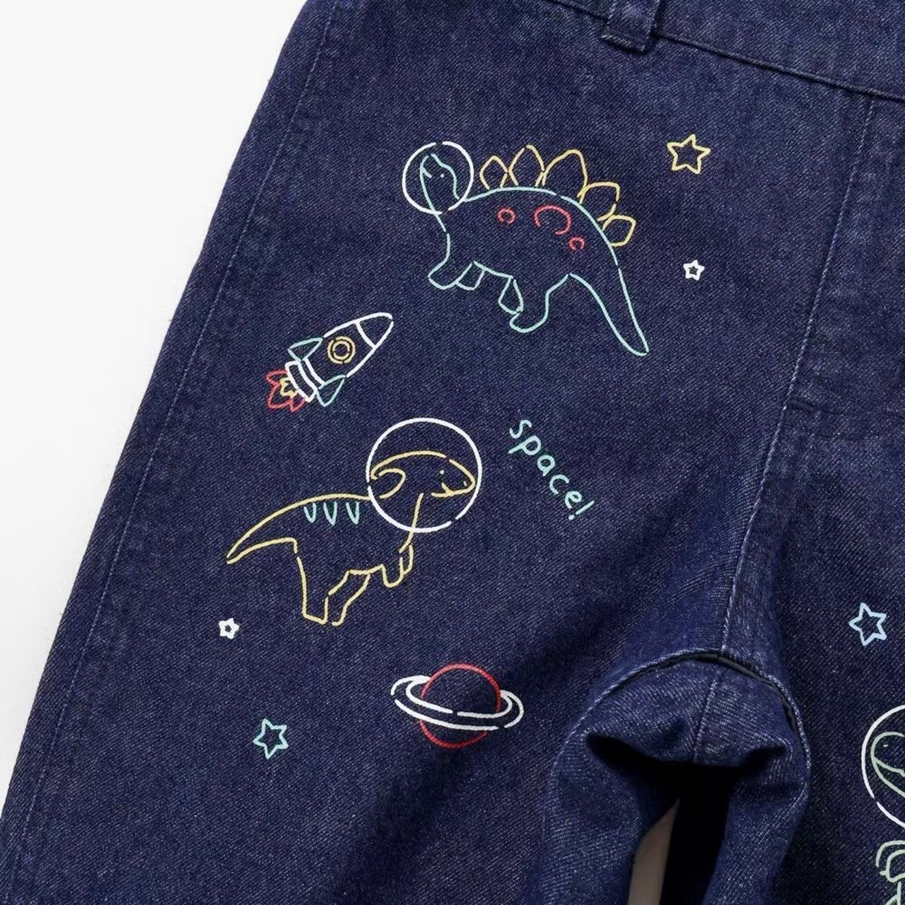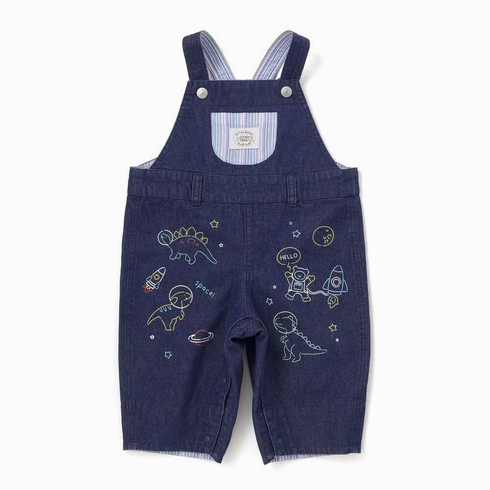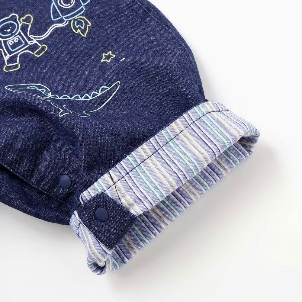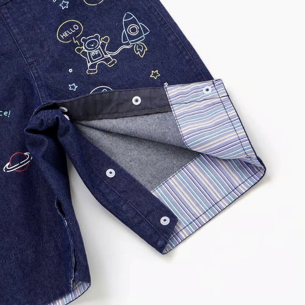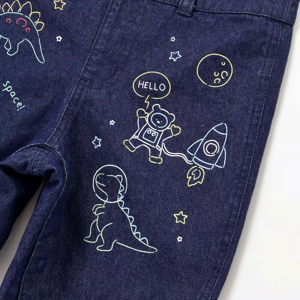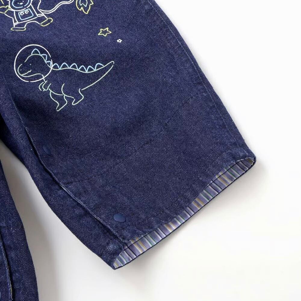 デニム生地には恐竜と宇宙のモチーフのプリントをオン!男の子の夢がギュギュっと詰め込みました。