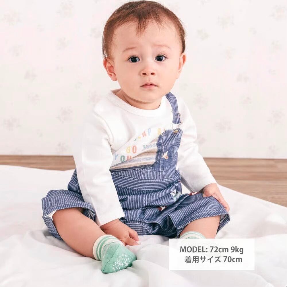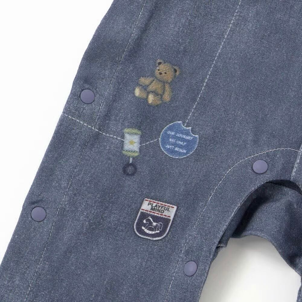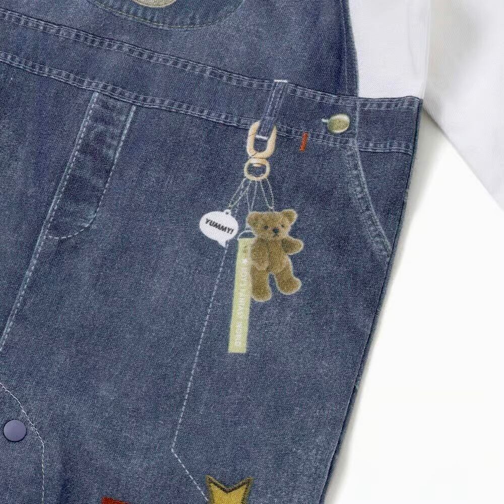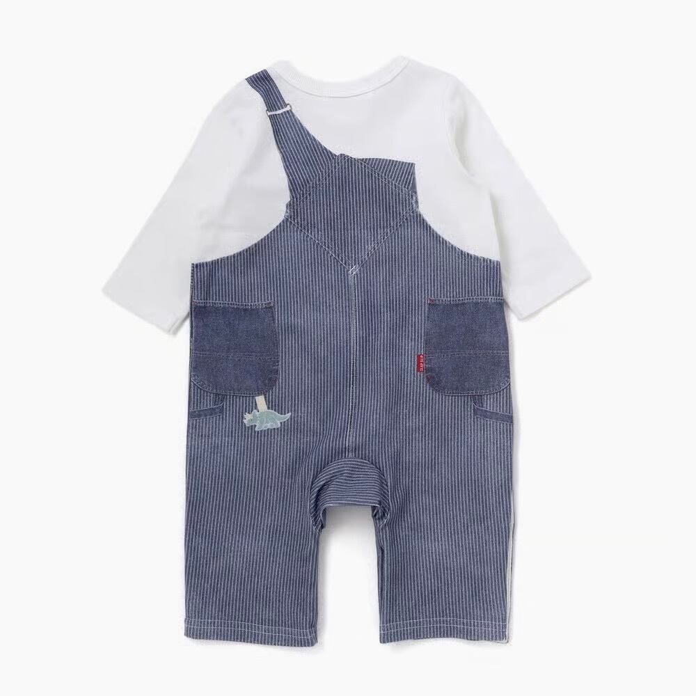 まるで本物のサロペットを着ているように見える、おしゃれな重ね着風プリントが魅力の男の子用長袖カバーオール。
