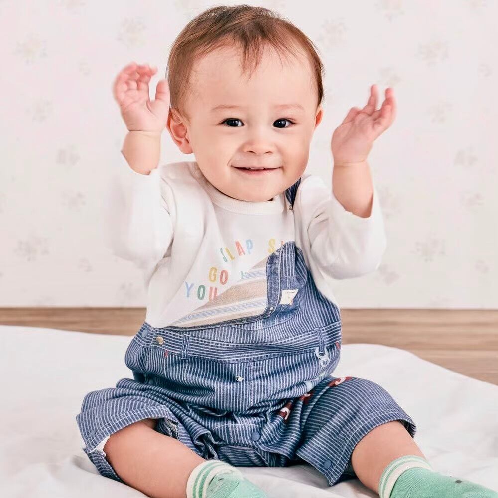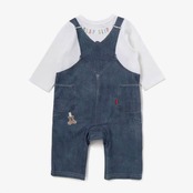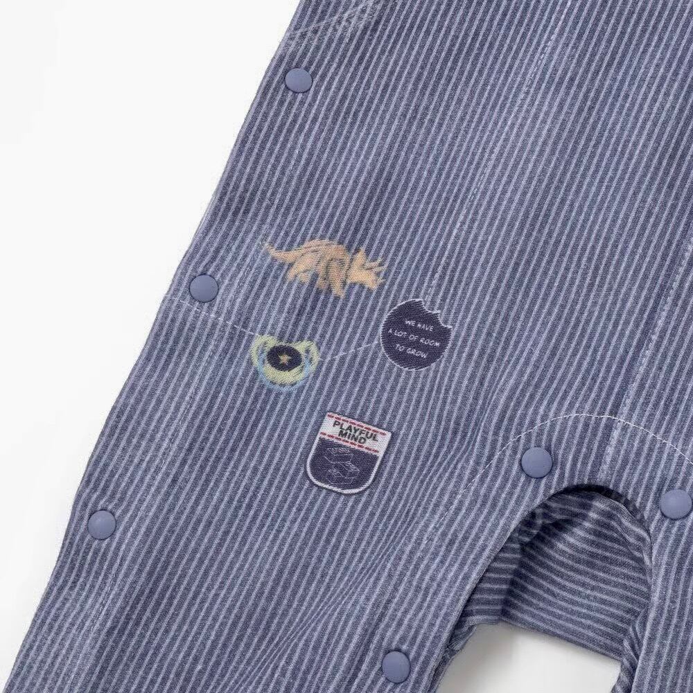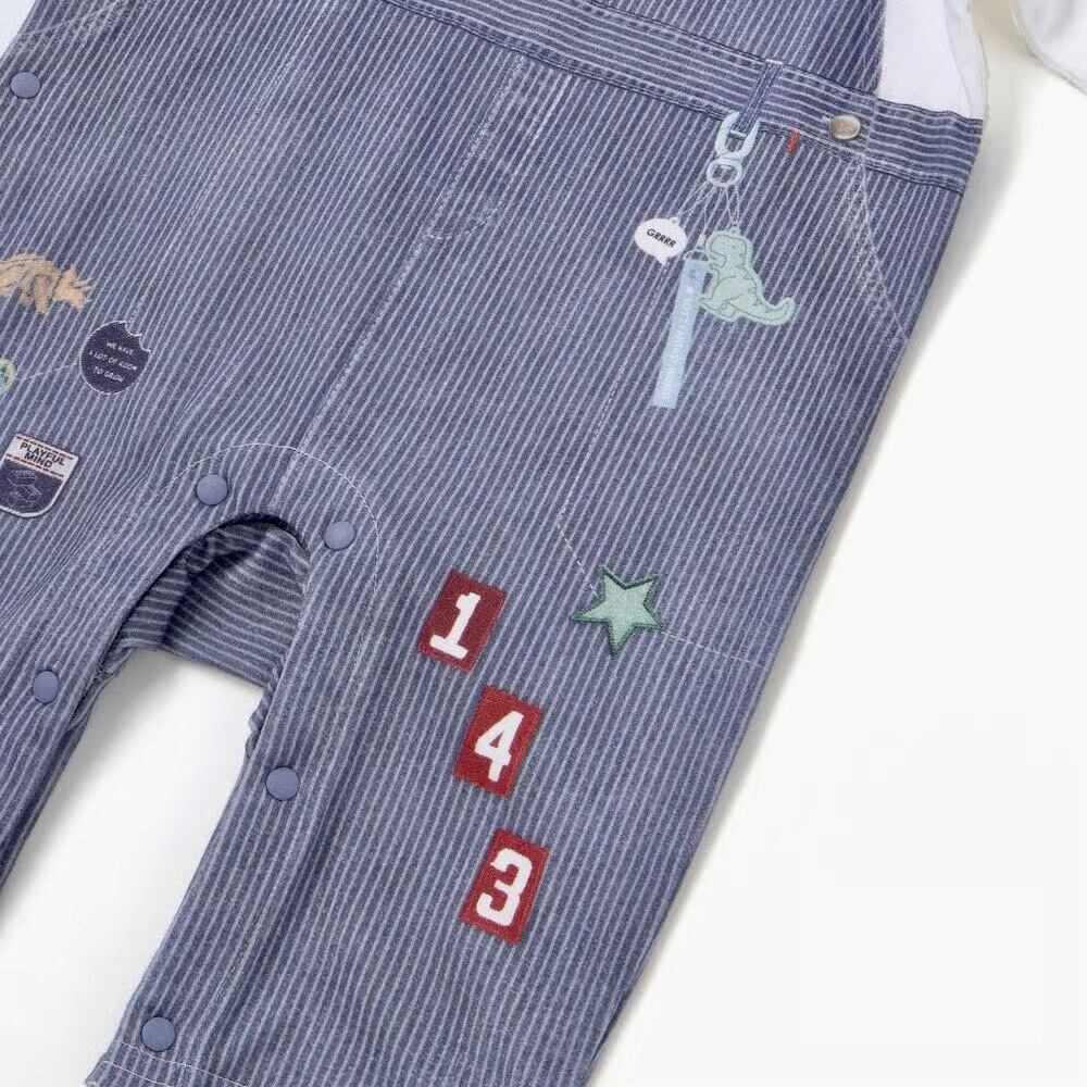まるで本物のサロペットを着ているように見える、おしゃれな重ね着風プリントが魅力の男の子用長袖カバーオール。