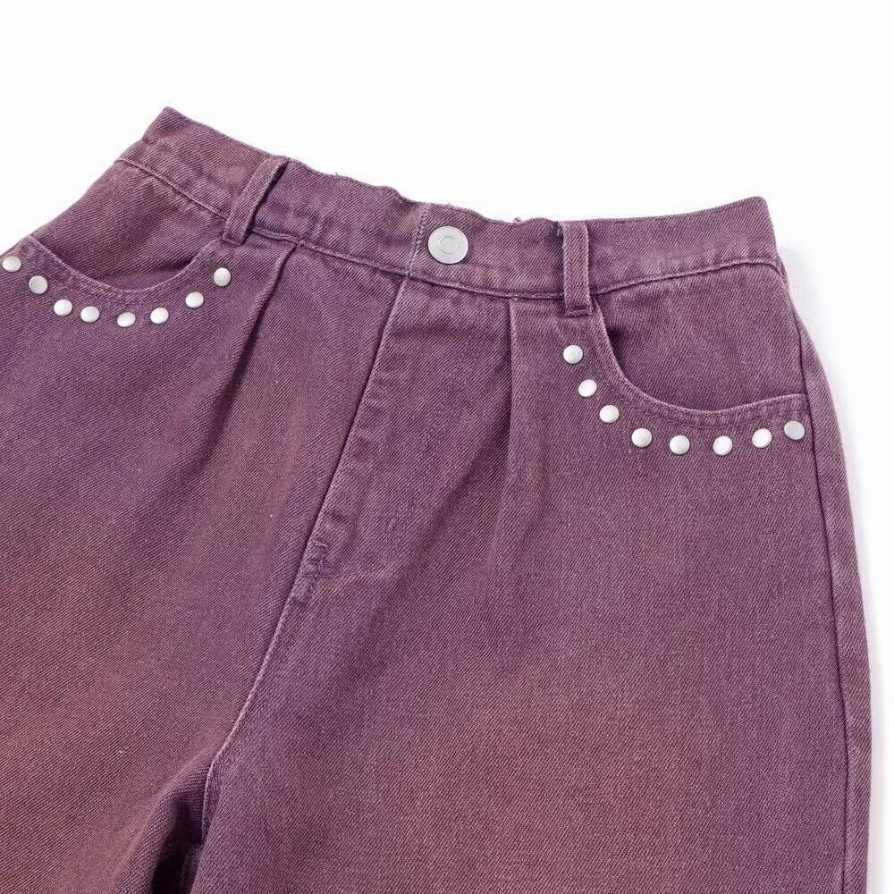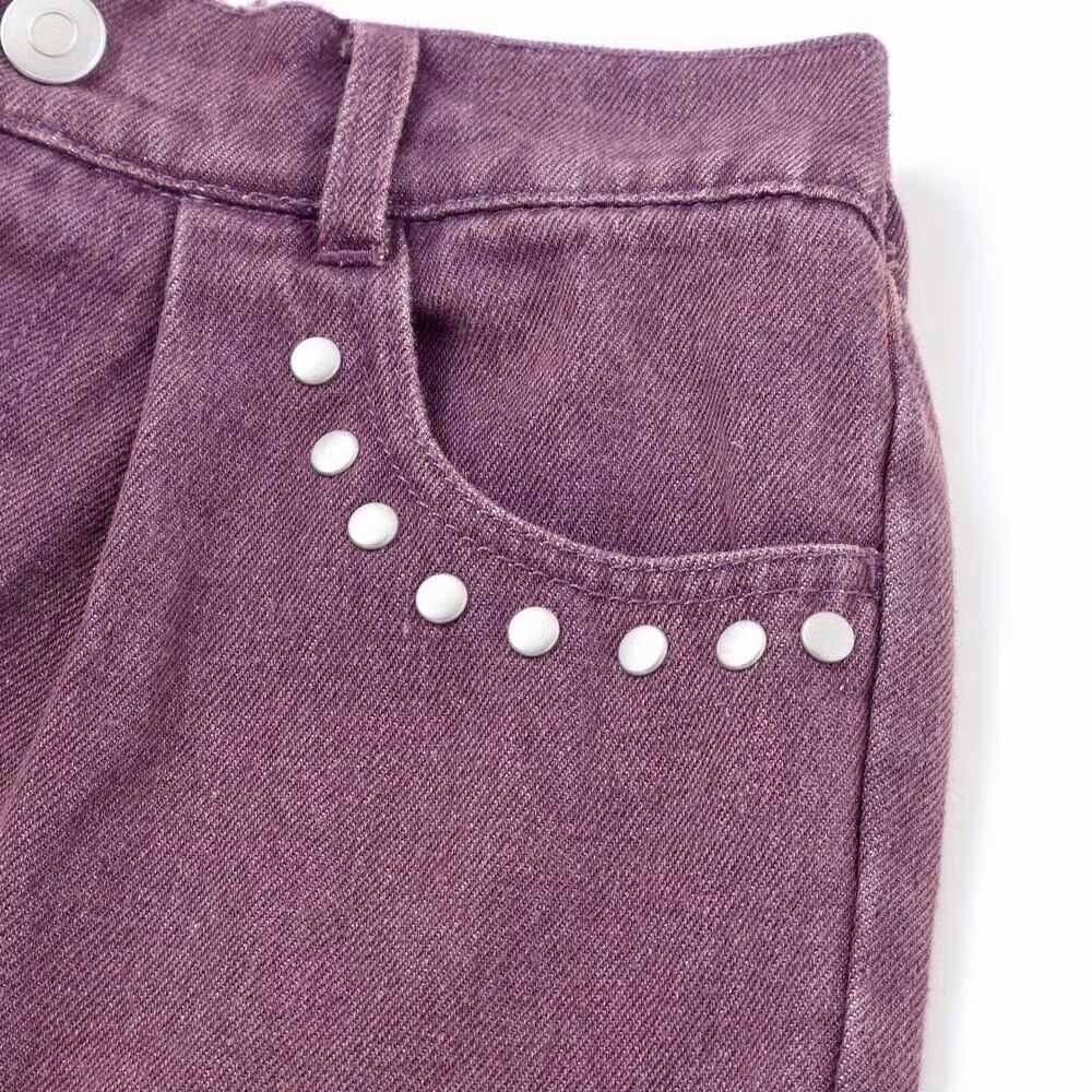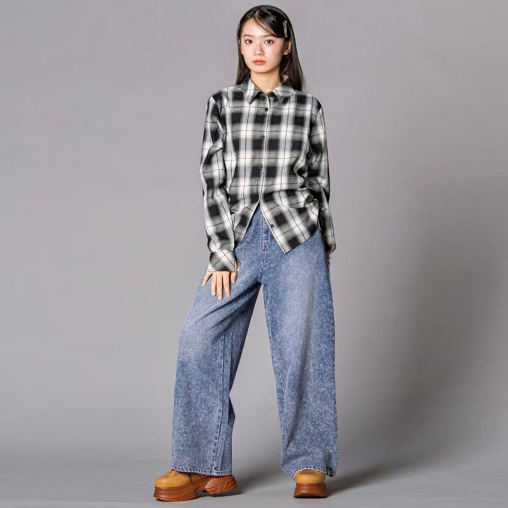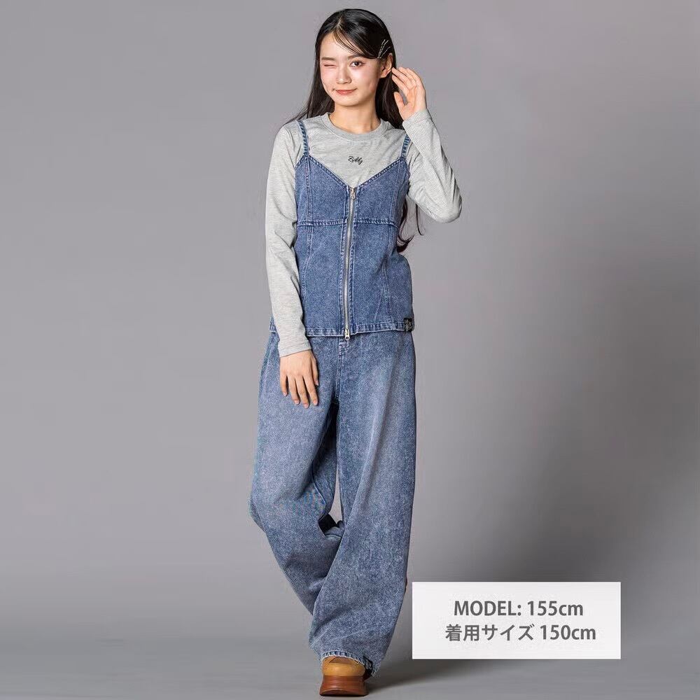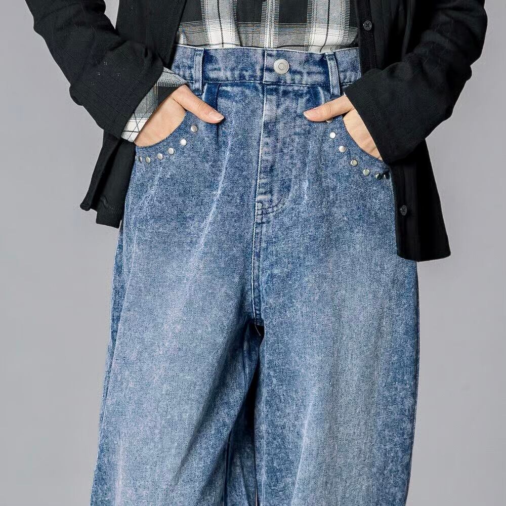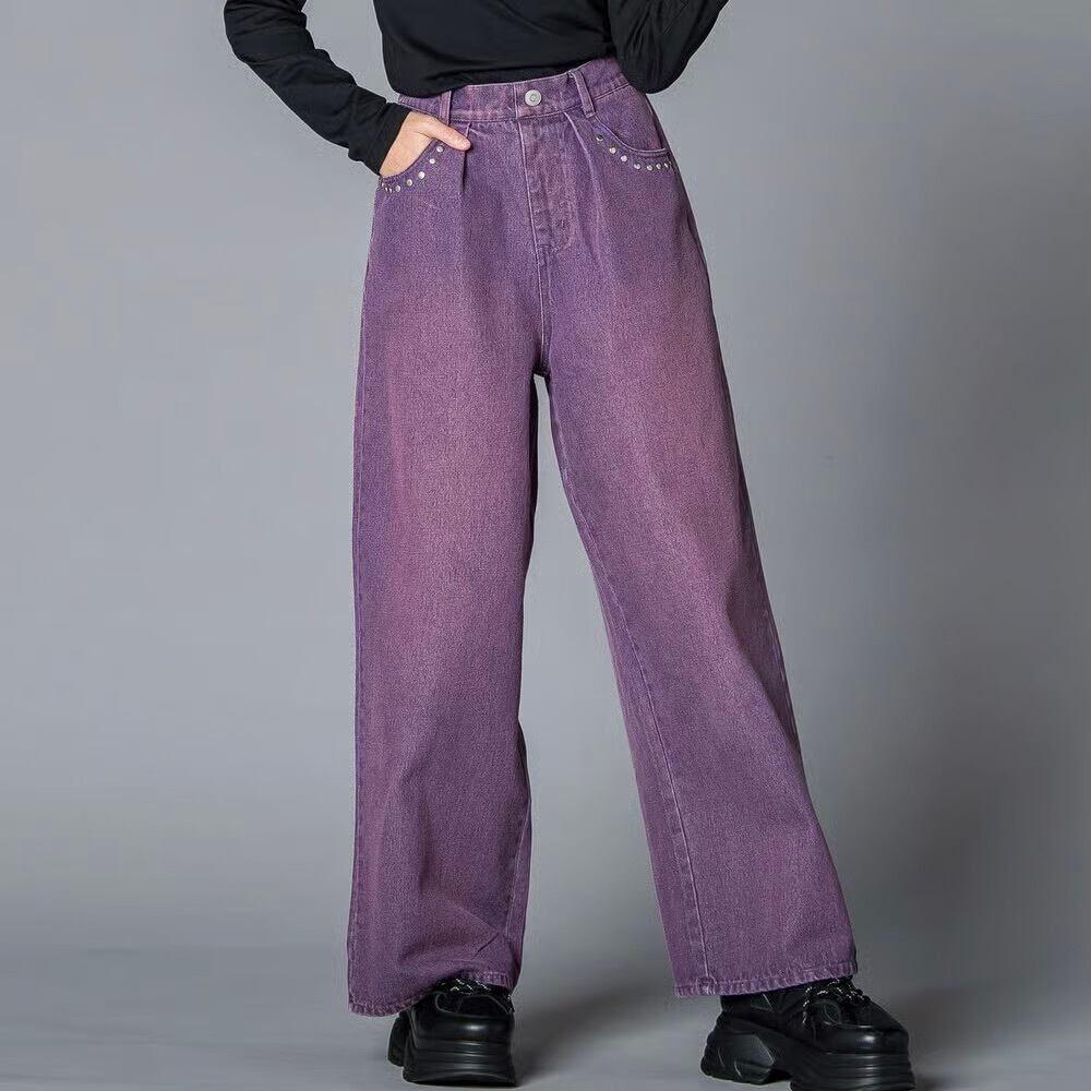 ウエスタンコアのスタッズをポケットに散りばめて、韓国ガールみたいな甘辛ムードに仕上げたデニムワイド。