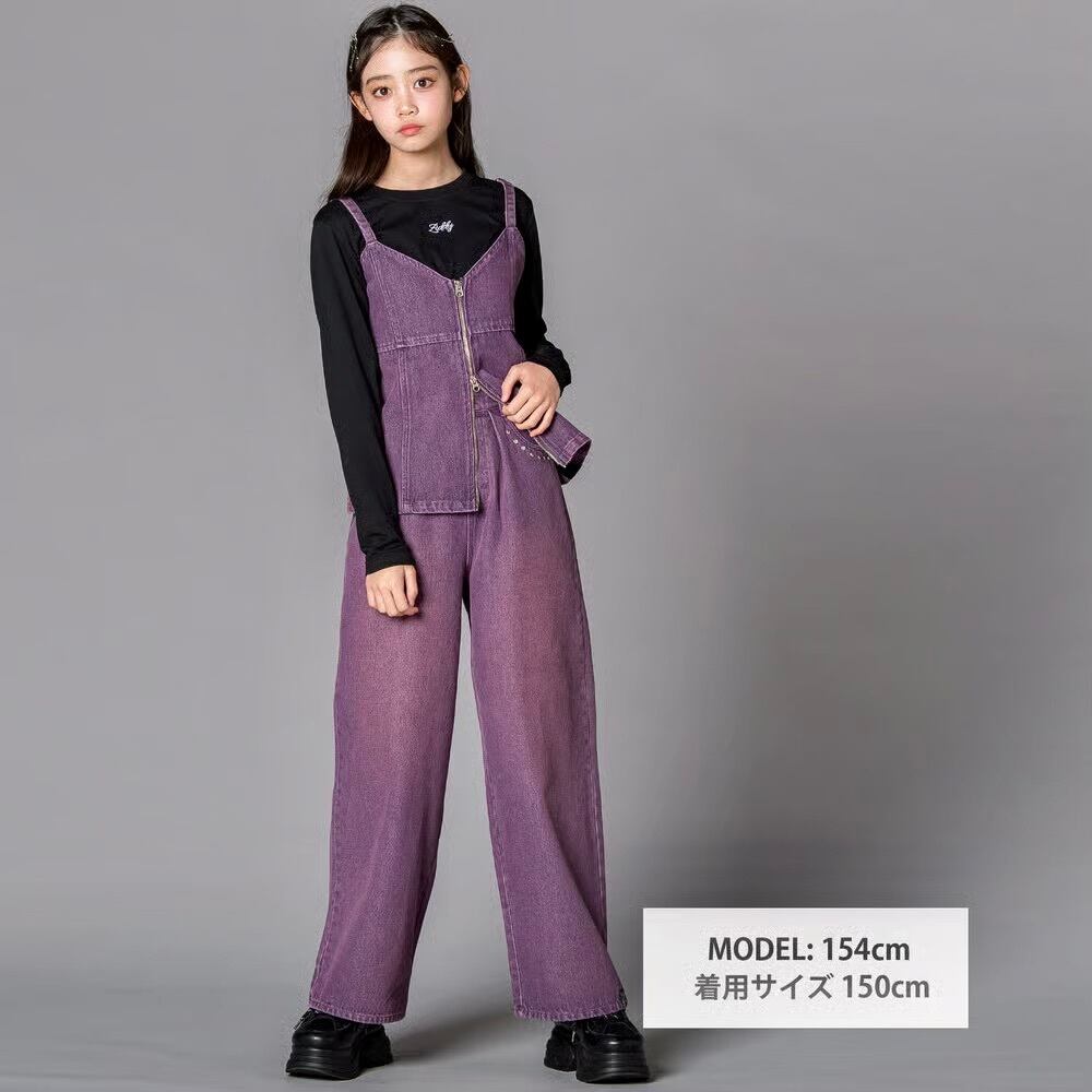 デニムビスチェ&TシャツSETとスタッズデニムワイドパンツには、バラモチーフのおそろいタグ付き。