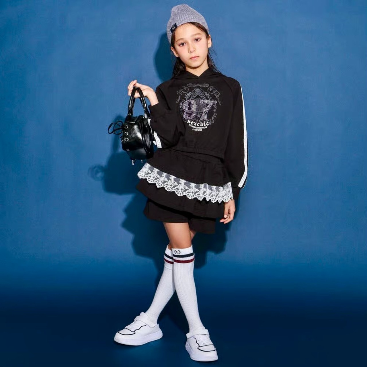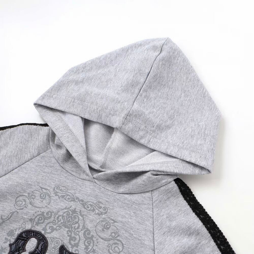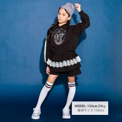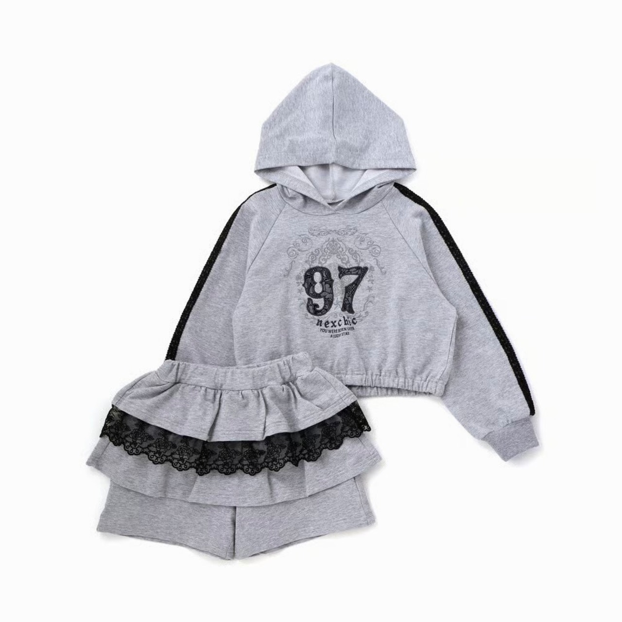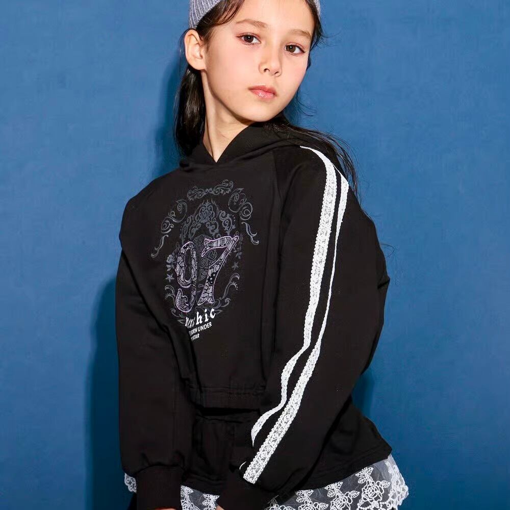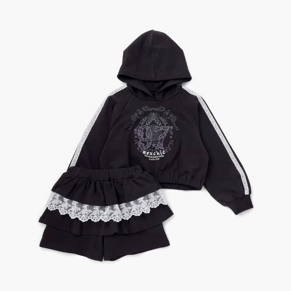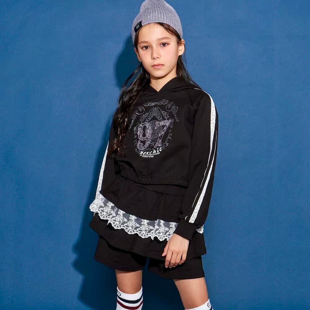ストリート感のあるフーディに、繊細なレースが甘さを添える女の子用ガーリーセットアップ。