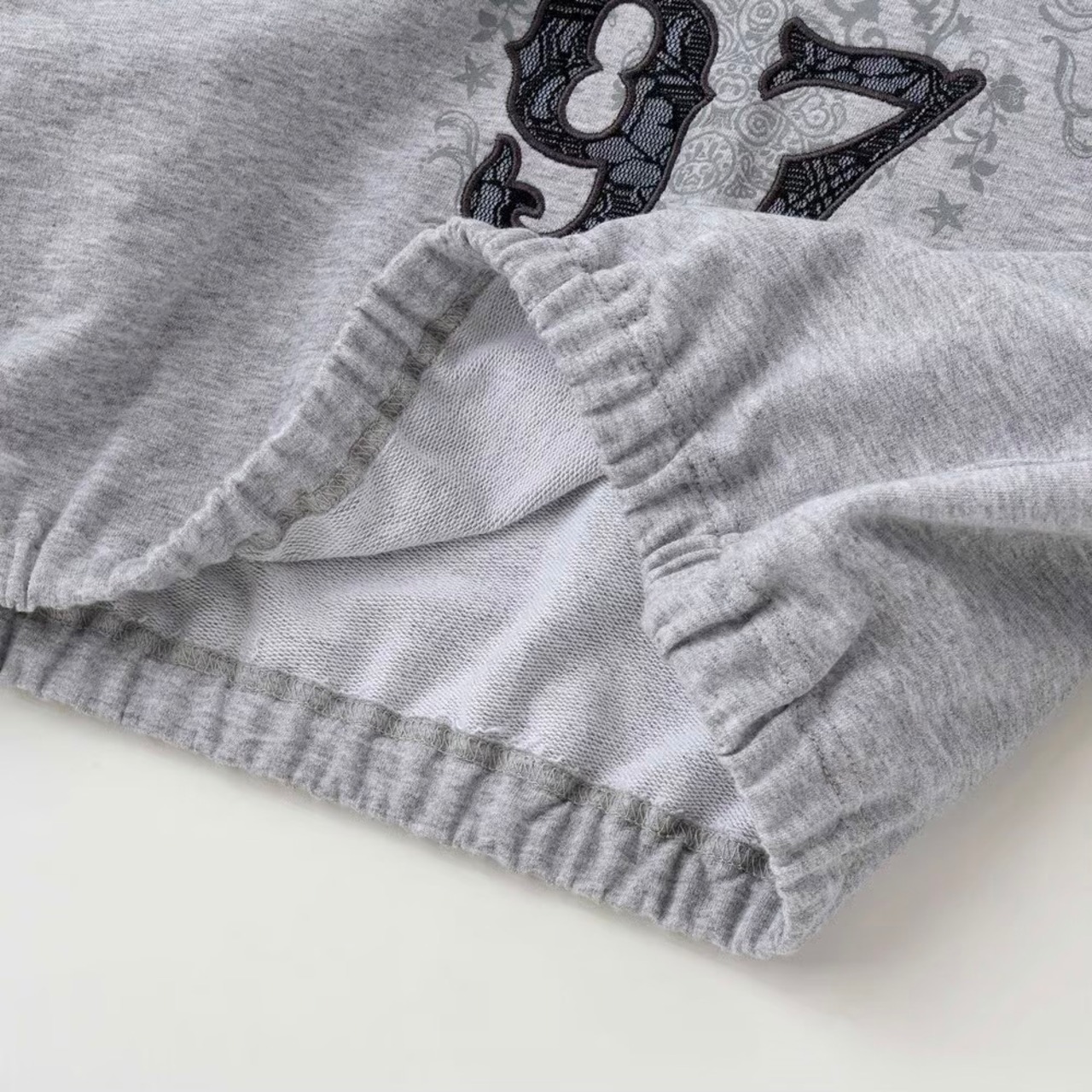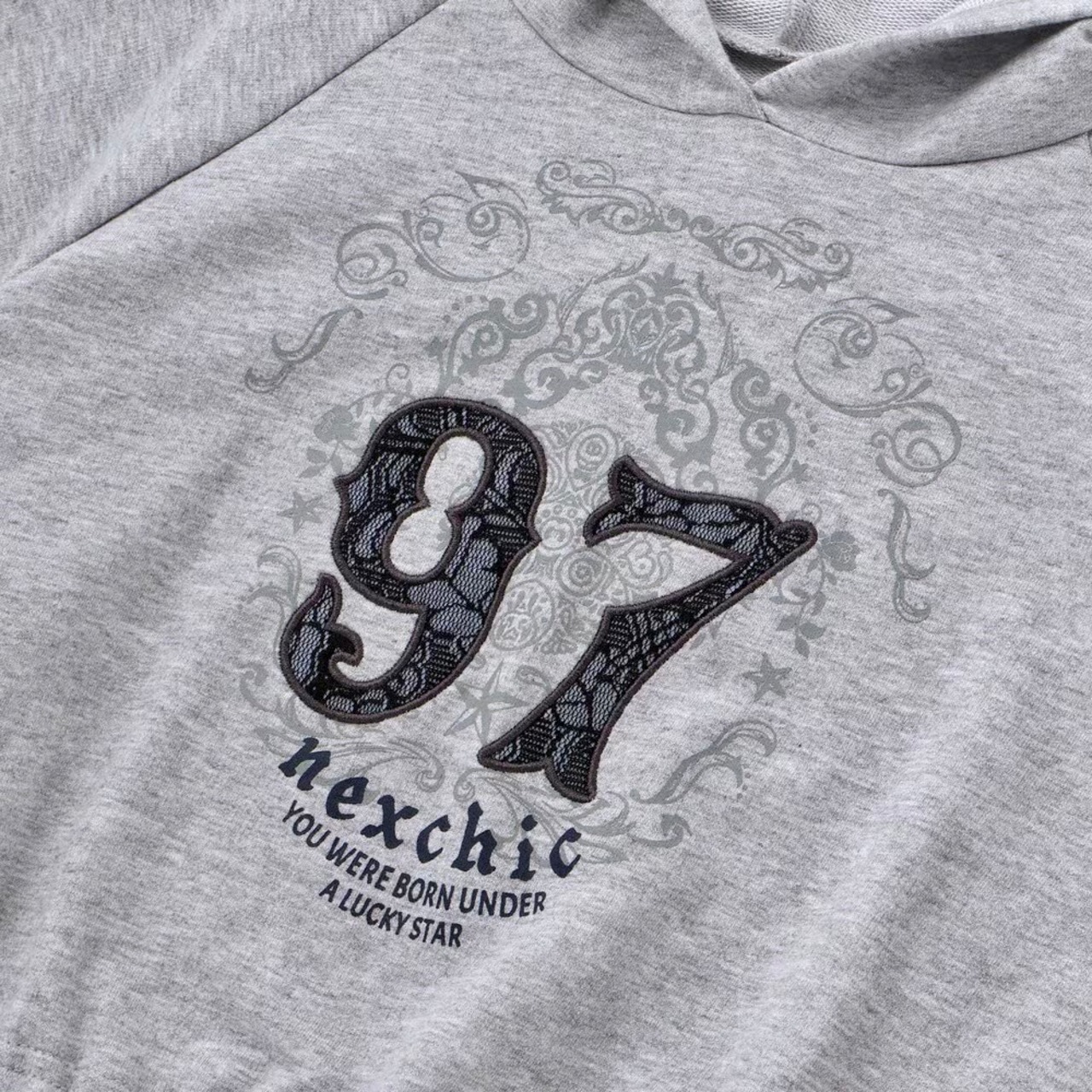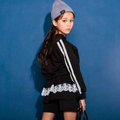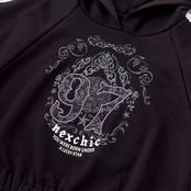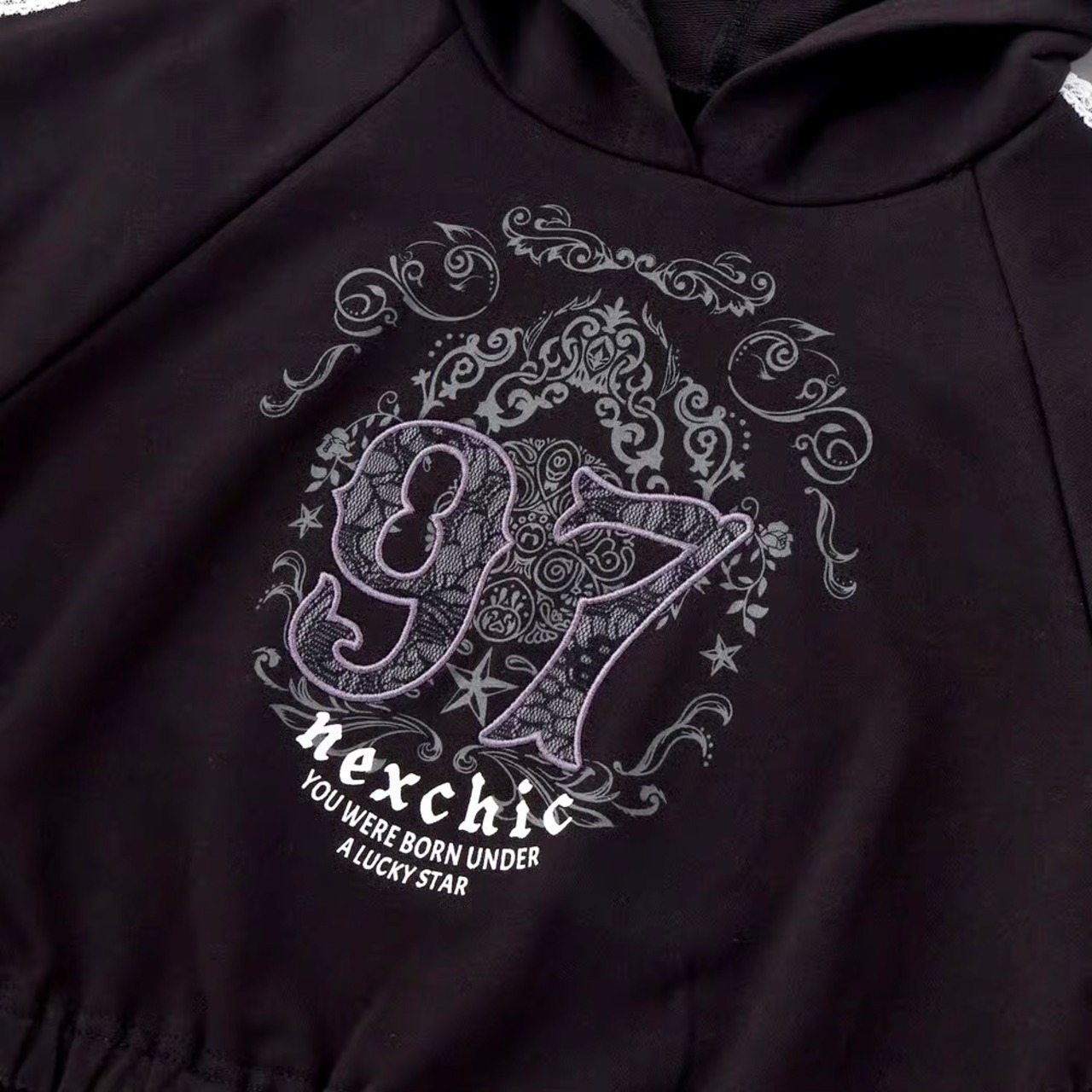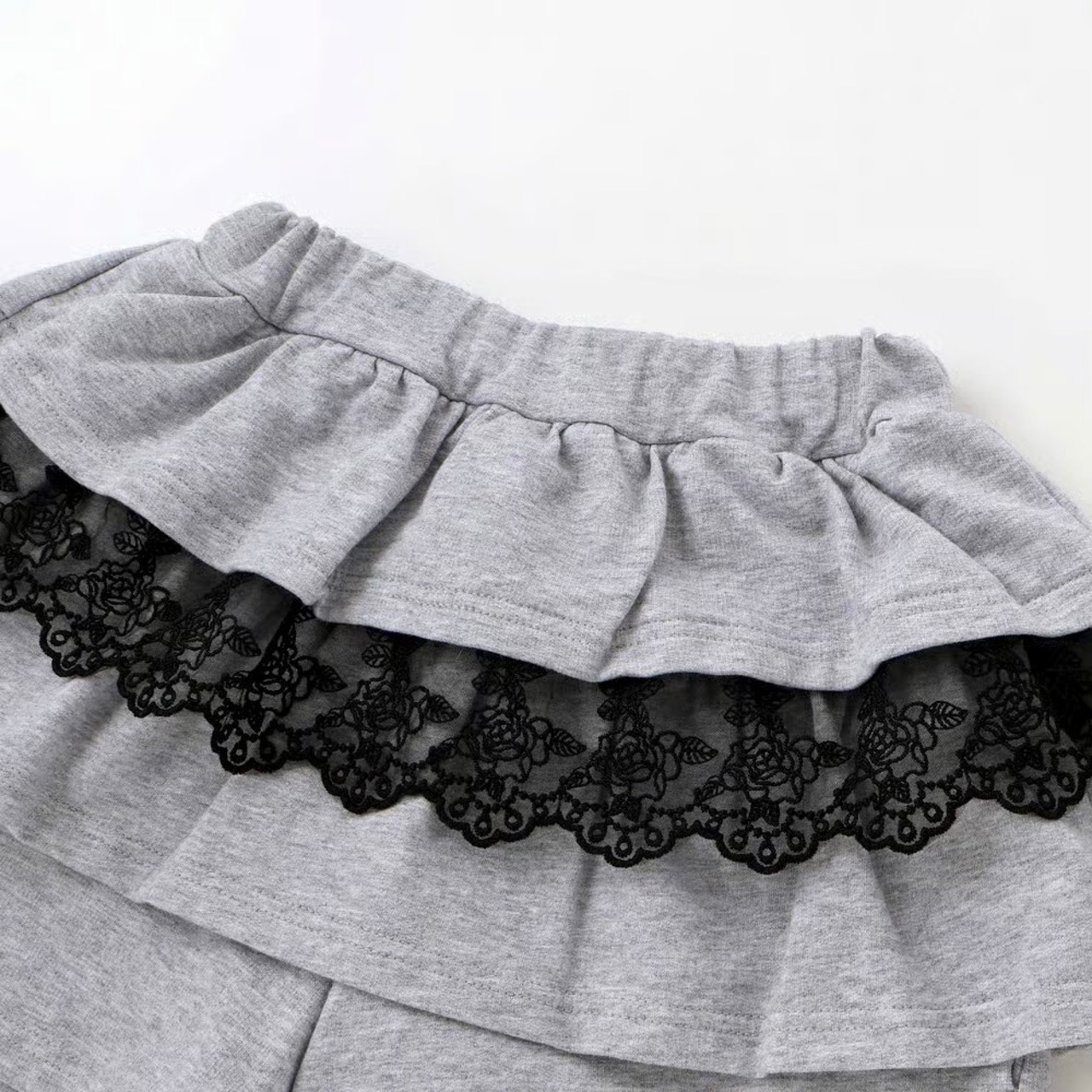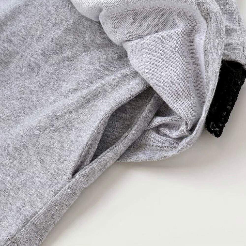 ストリート感のあるフーディに、繊細なレースが甘さを添える女の子用ガーリーセットアップ。