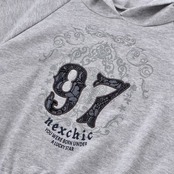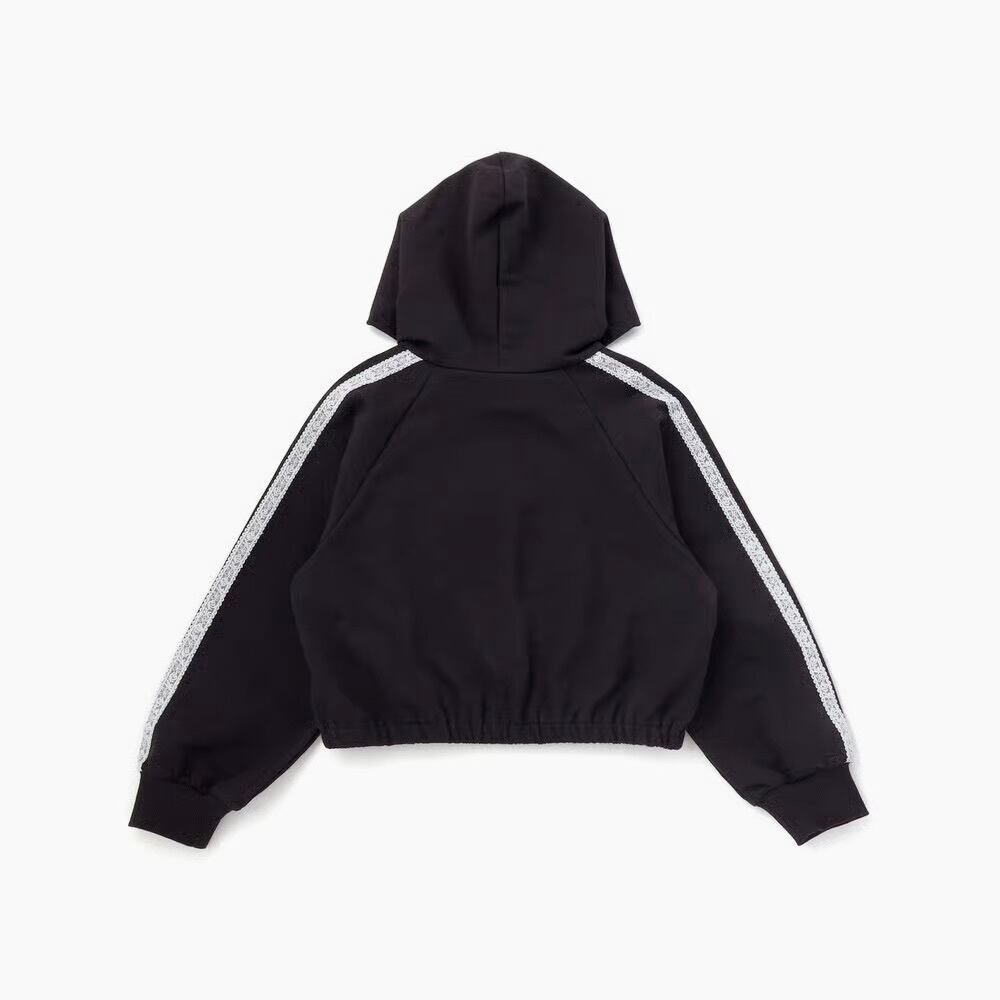 フーディの胸元には存在感のあるロゴプリントを施し、袖にはレーステープのラインを走らせることでスポーティーな中にエレガントさをプラス。