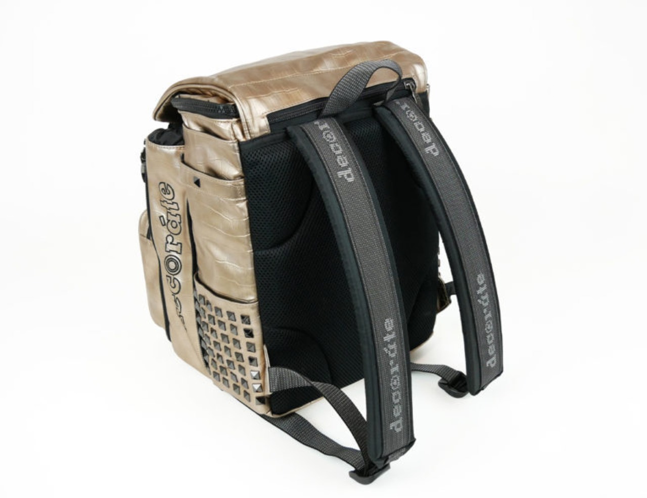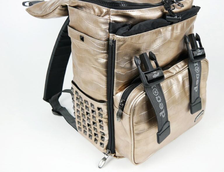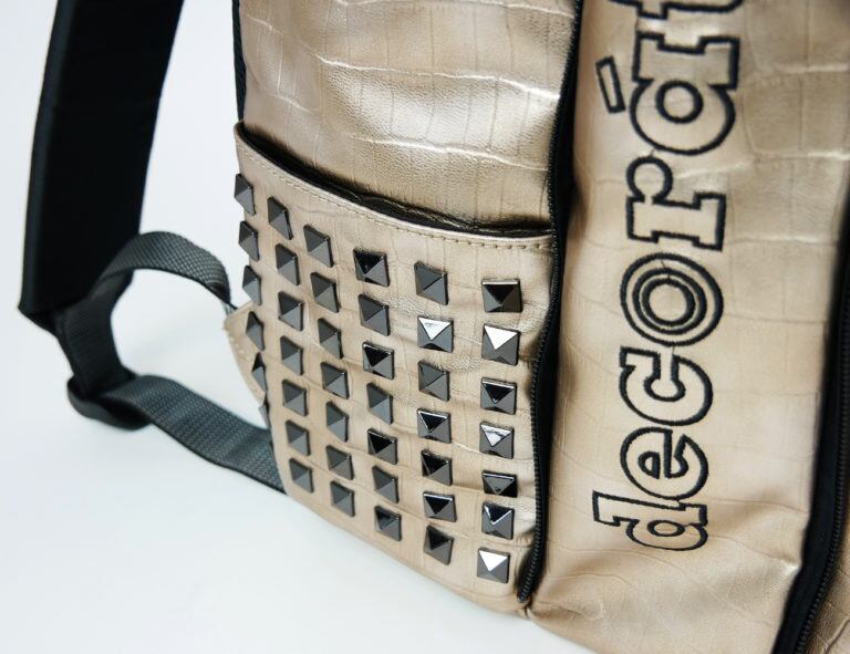 左右サイドのスタッズは、メイン素材・シンセティックレザーとのバランスを重視して、光沢感を抑えたものに。派手なだけではない、バランスの良い高級感が漂います。