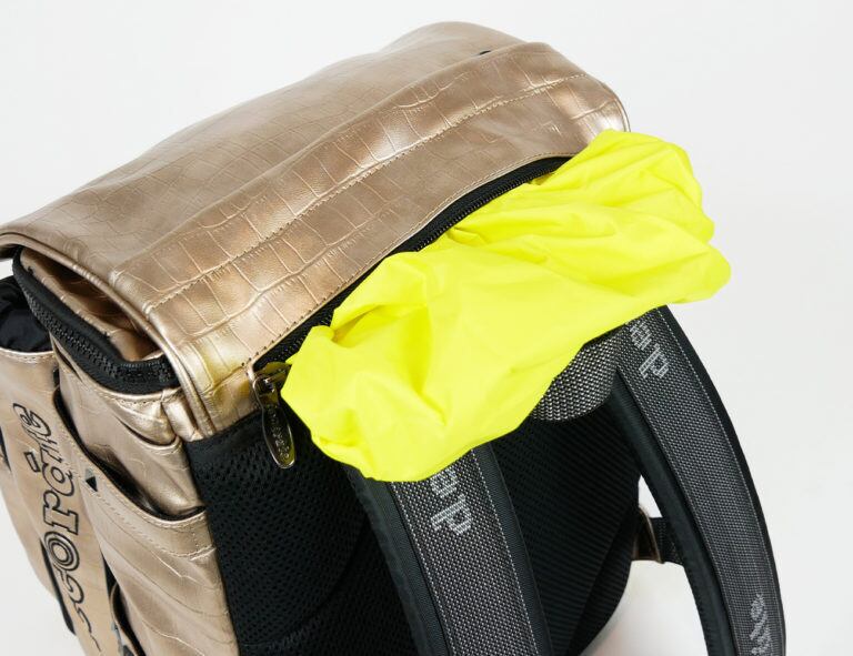 また、メインフラップには収納式のレインカバーを内蔵。ファスナーから引き出してそのまますっぽりと全体に被せるだけなので、急な荒天でも安心です。