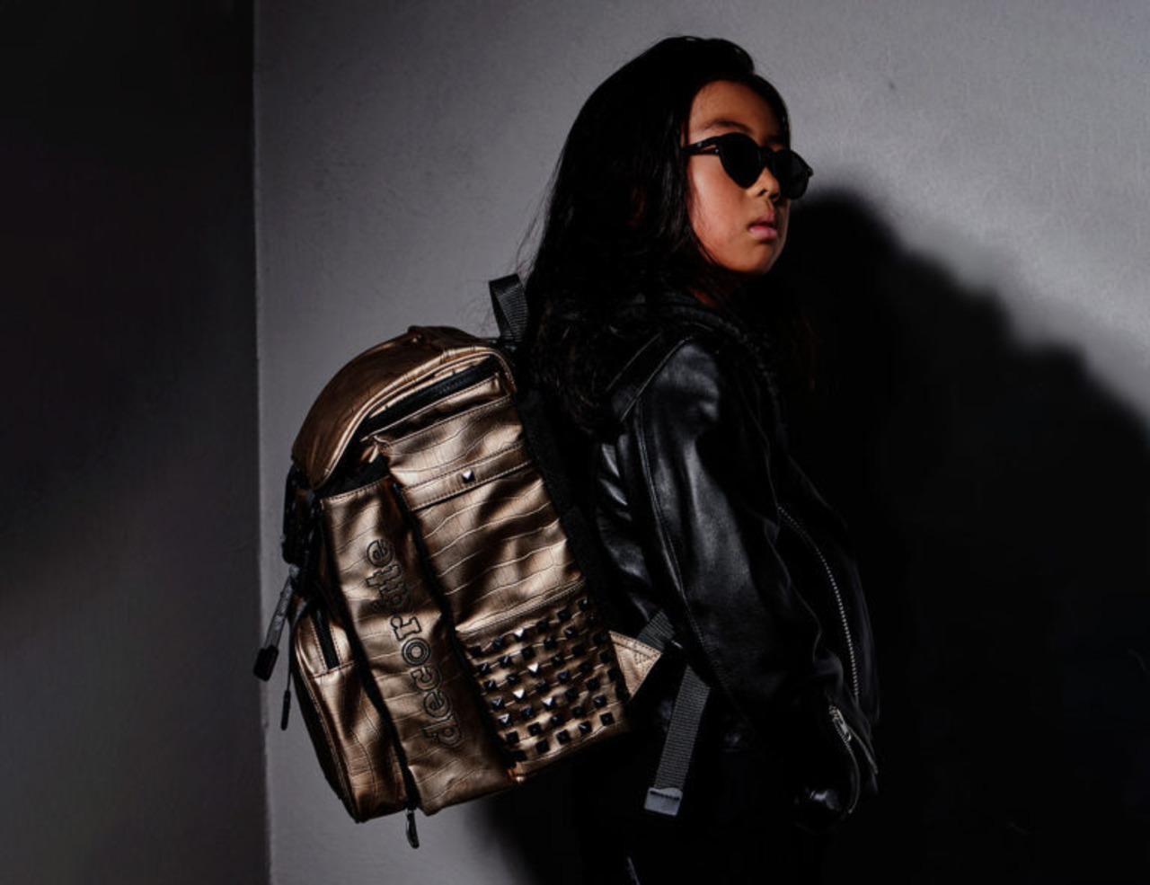 型押しのシンセティックレザーにスタッズを組み合わせた、リッチなムード満点のモデル[newtro]。