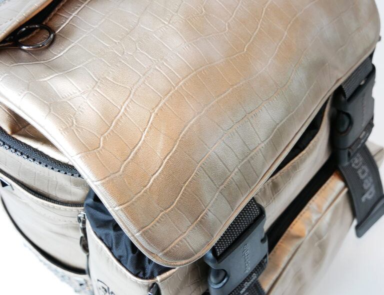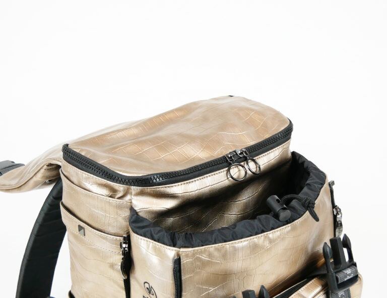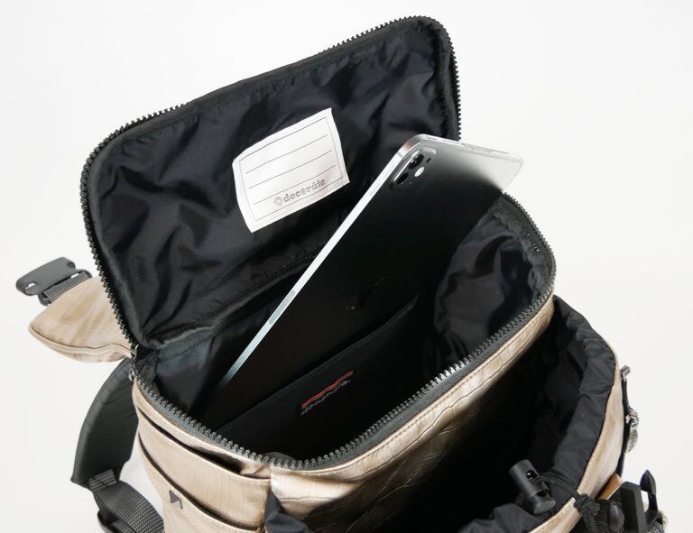 そんなメインコンパートメントの外側には、両サイドにファスナーを備えたサブコンパートメントが。こちらはファスナーでコンパートメントの奥行きを詰めたり広げたりできるので、荷物が少ないときにはコンパクトなシルエットで使うことが可能です。