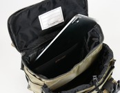 A4サイズのクリアファイルも収まるメインコンパートメント内には、タブレットスリーブを標準装備。そしてそれ以外にはあえてポケットなどを設けず、シンプルな箱型にデザインしているので、必要な荷物をどんどん詰め込めます。