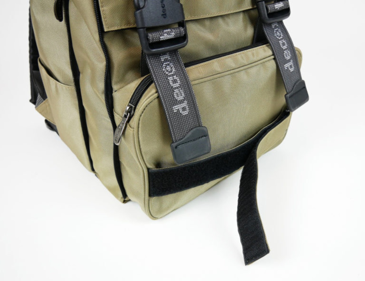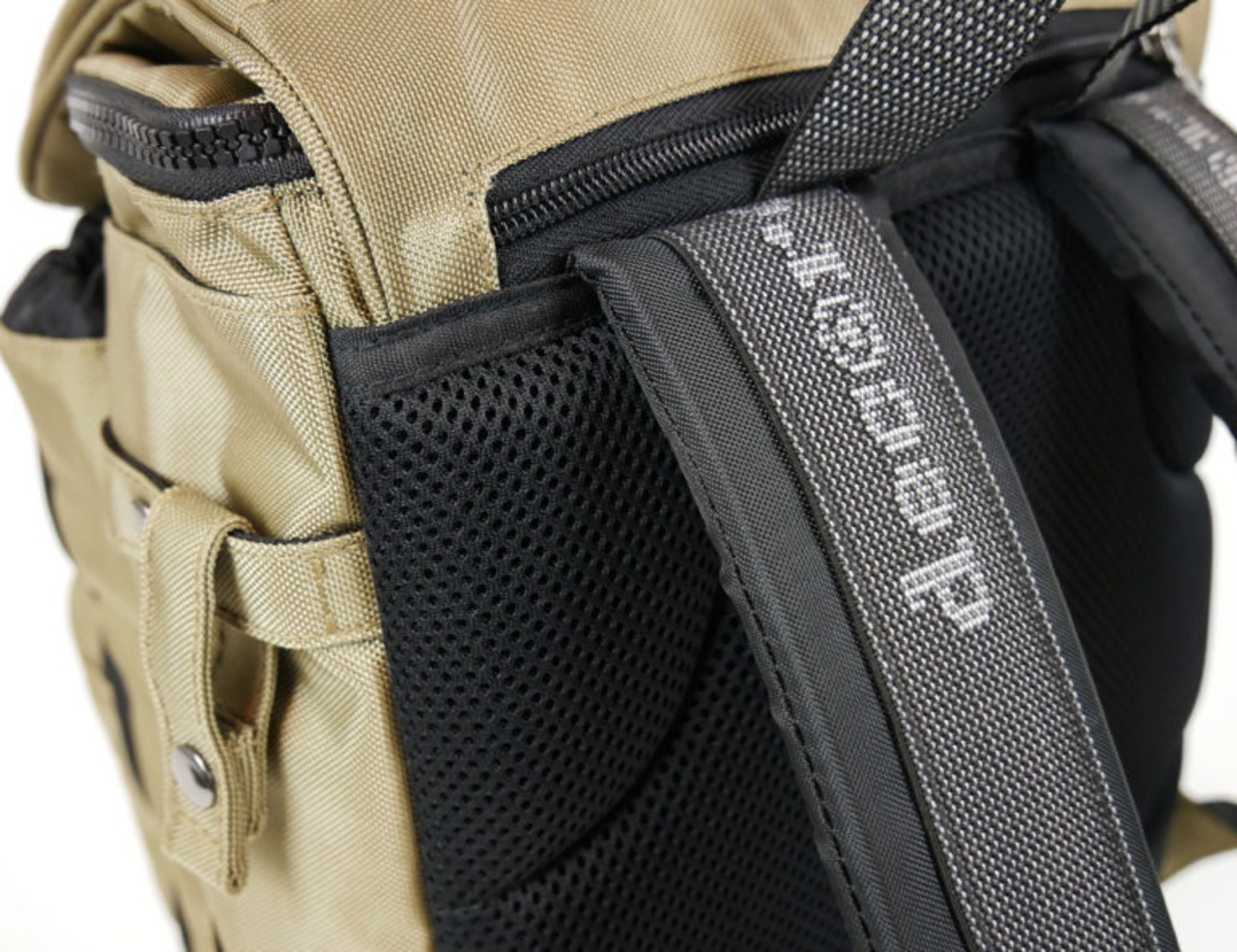 右サイドには、キャップなどの小物を留めることができるストラップも付属しています。