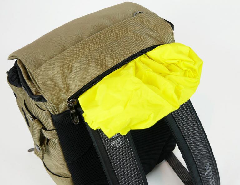 また、メインフラップには収納式のレインカバーを内蔵。ファスナーから引き出してそのまますっぽりと全体に被せるだけなので、急な荒天でも安心です。
