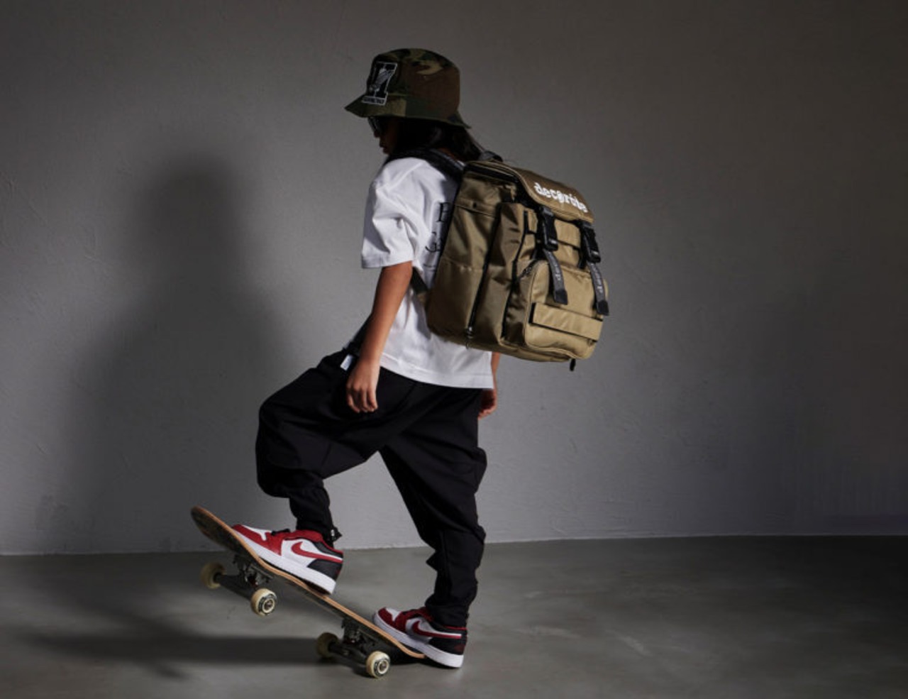 ストリート的なニュアンスのカラーにステンシル風のロゴプリントをプラスした、クールなデザインです。
