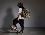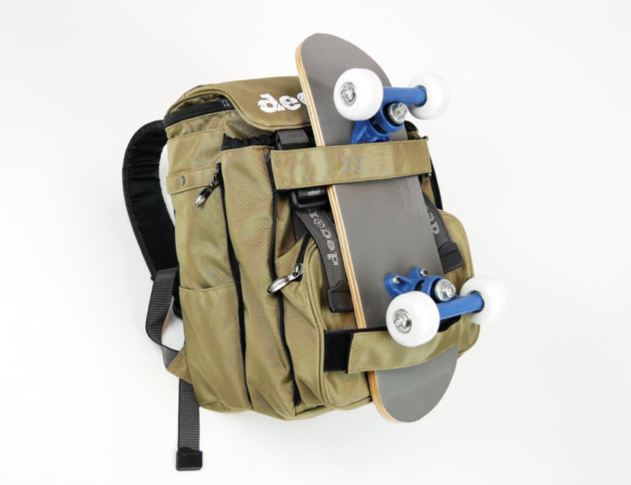 外側の上下2本のボードストラップにスケートボードをセットできるので、スケボーキッズに最適! ストラップは本体と同色なので、ボードをセットせずに普段使いするのもOK。