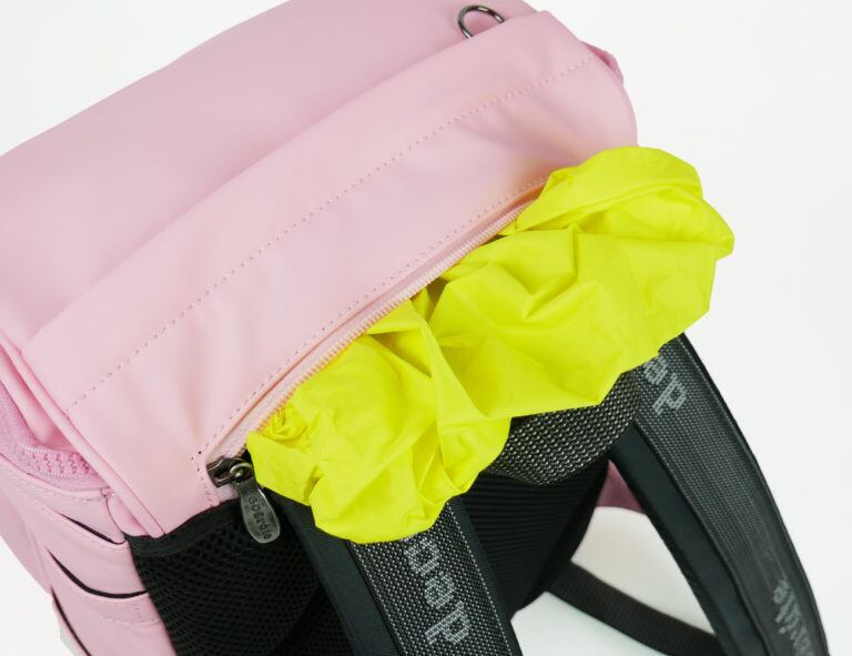また、メインフラップには収納式のレインカバーを内蔵。ファスナーから引き出してそのまますっぽりと全体に被せるだけなので、急な荒天でも安心です。