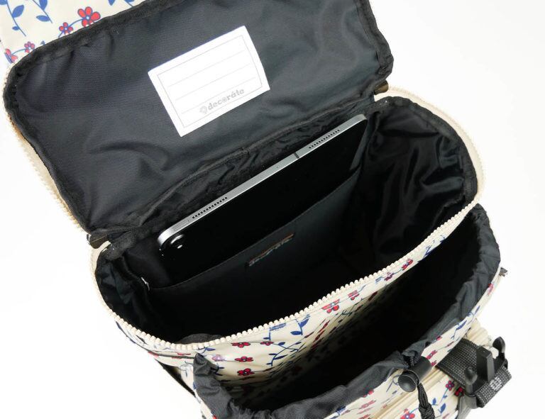 A4サイズのクリアファイルも収まるメインコンパートメント内には、タブレットスリーブを標準装備。そしてそれ以外にはあえてポケットなどを設けず、シンプルな箱型にデザインしているので、必要な荷物をどんどん詰め込めます。