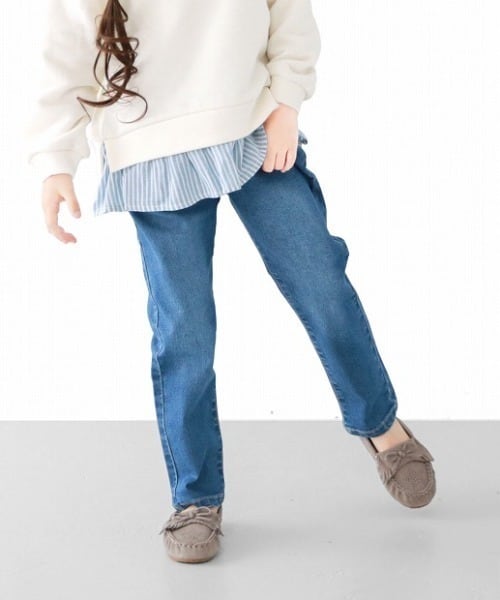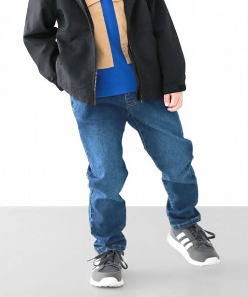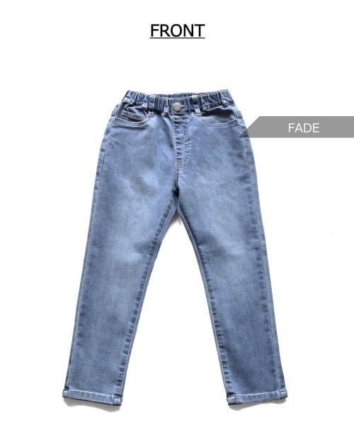 定番素材のハイストレッチデニムを使用した、シンプルなスリムストレートパンツ。