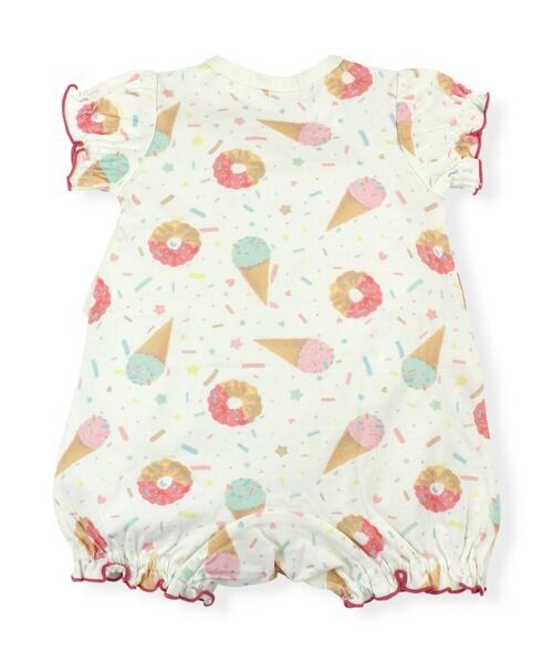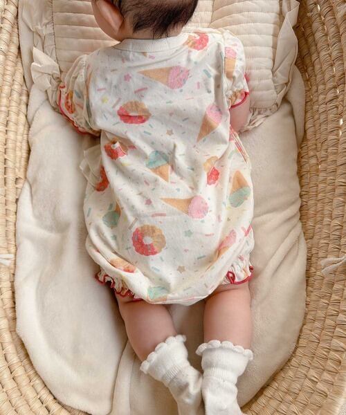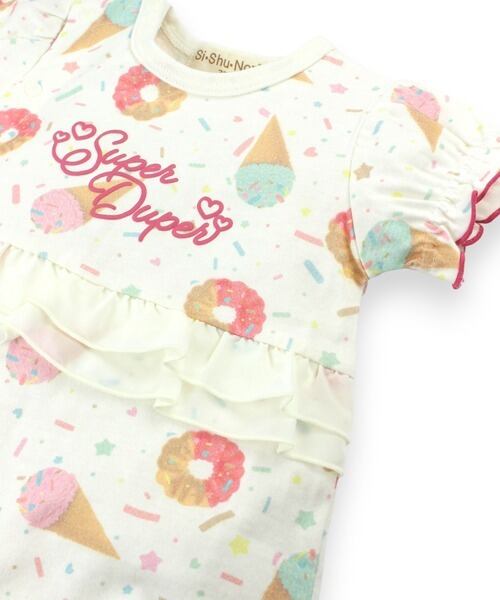 アイス、ドーナツ、りぼんの大きめモチーフ総柄にウエストフリルがポイント!