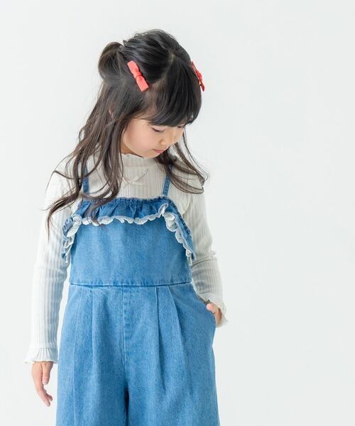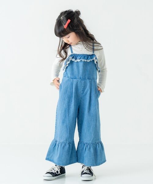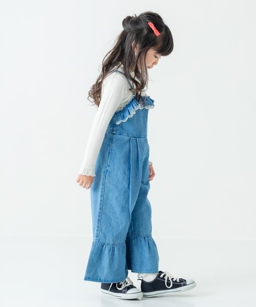 フリル袖やレーストップスを合わせると、サロペットの可愛さがさらにアップ。