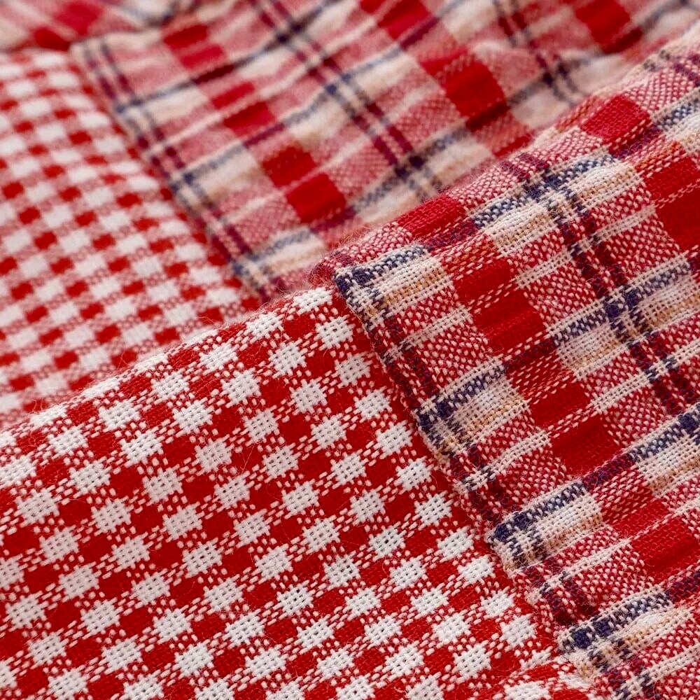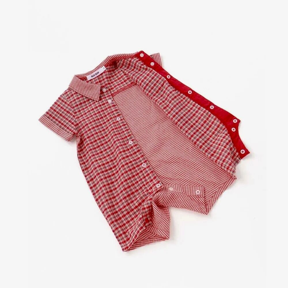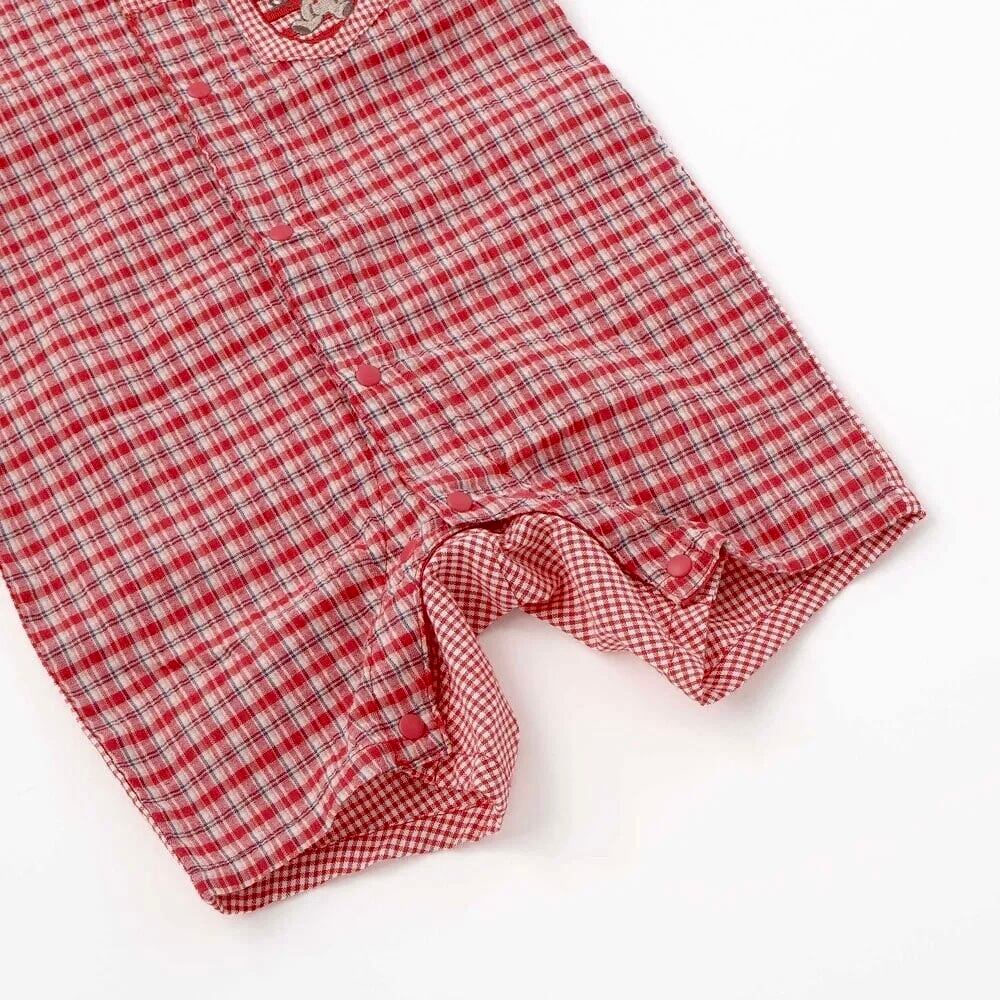 2種類のチェックを組み合わせた、遊び心のある男の子用半袖ロンパース。