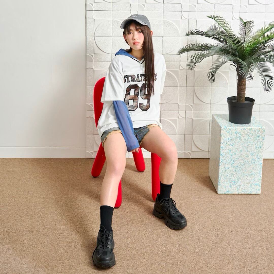 カーゴパンツやルーズ感のあるボトムと合わせたストリートコーデがおすすめです。