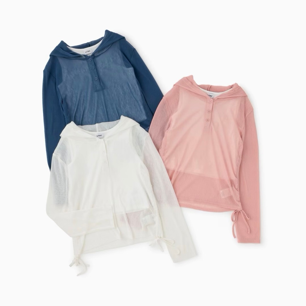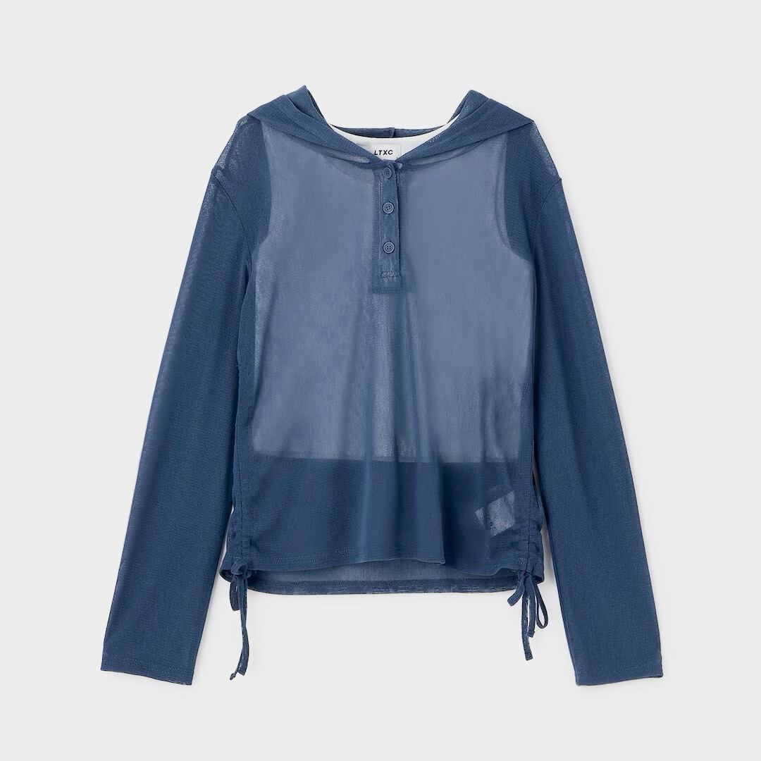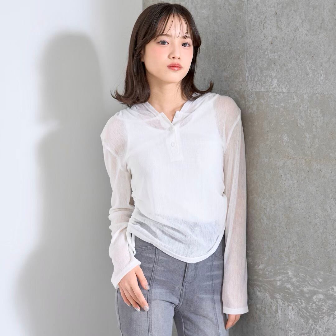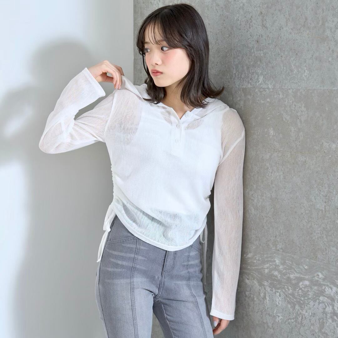 涼しげな透け感がポイントになっているフードつきのシアーニットカットソーです。