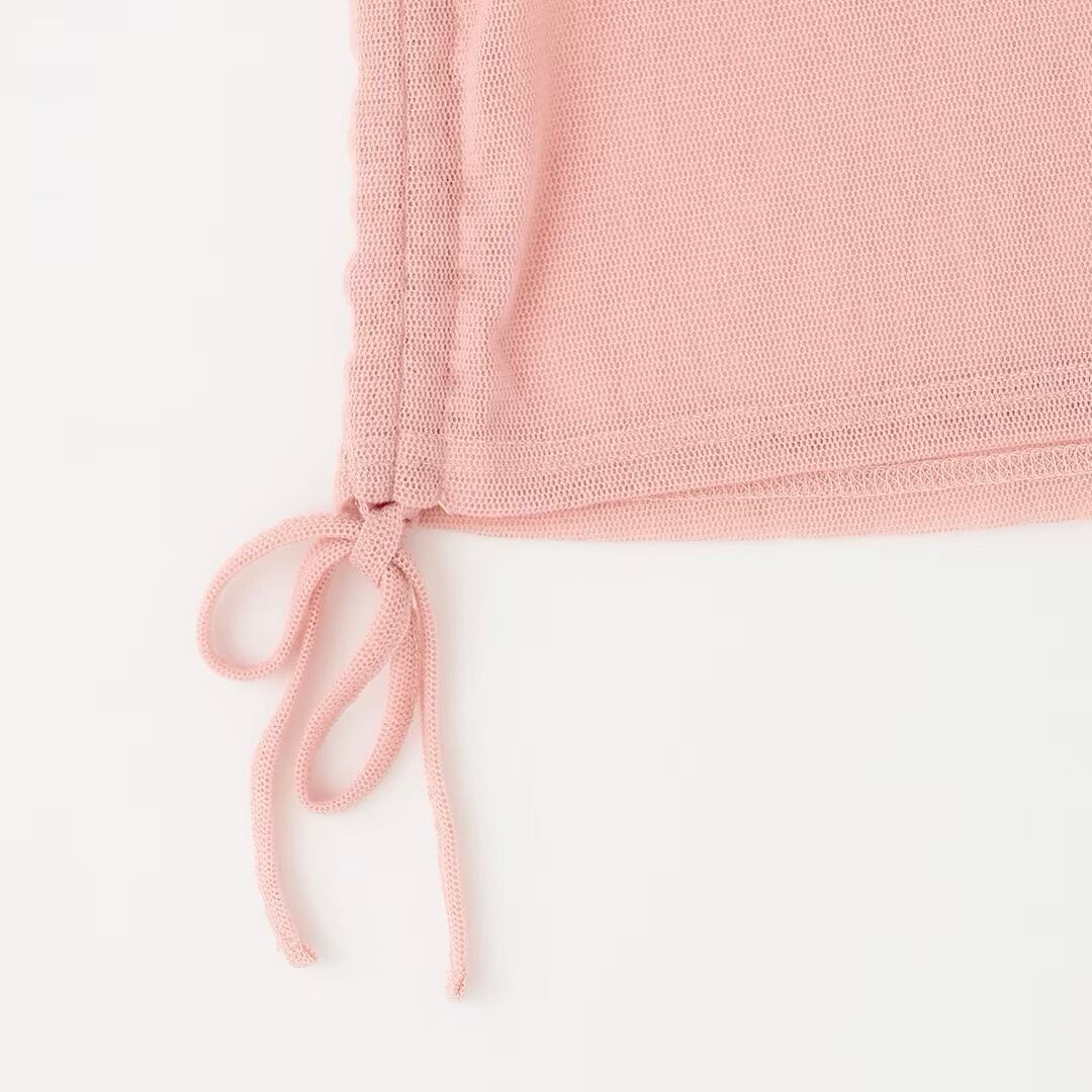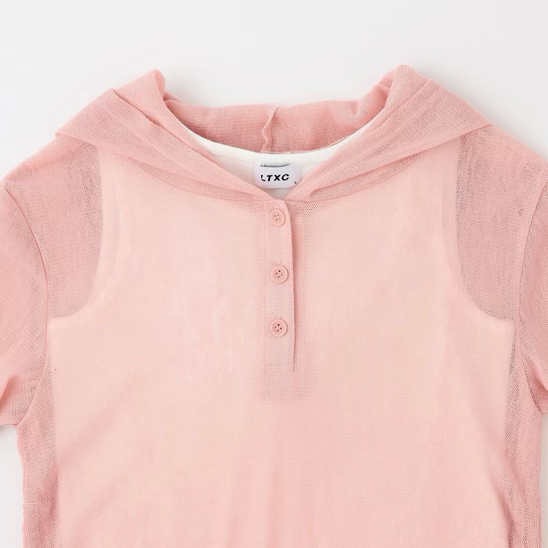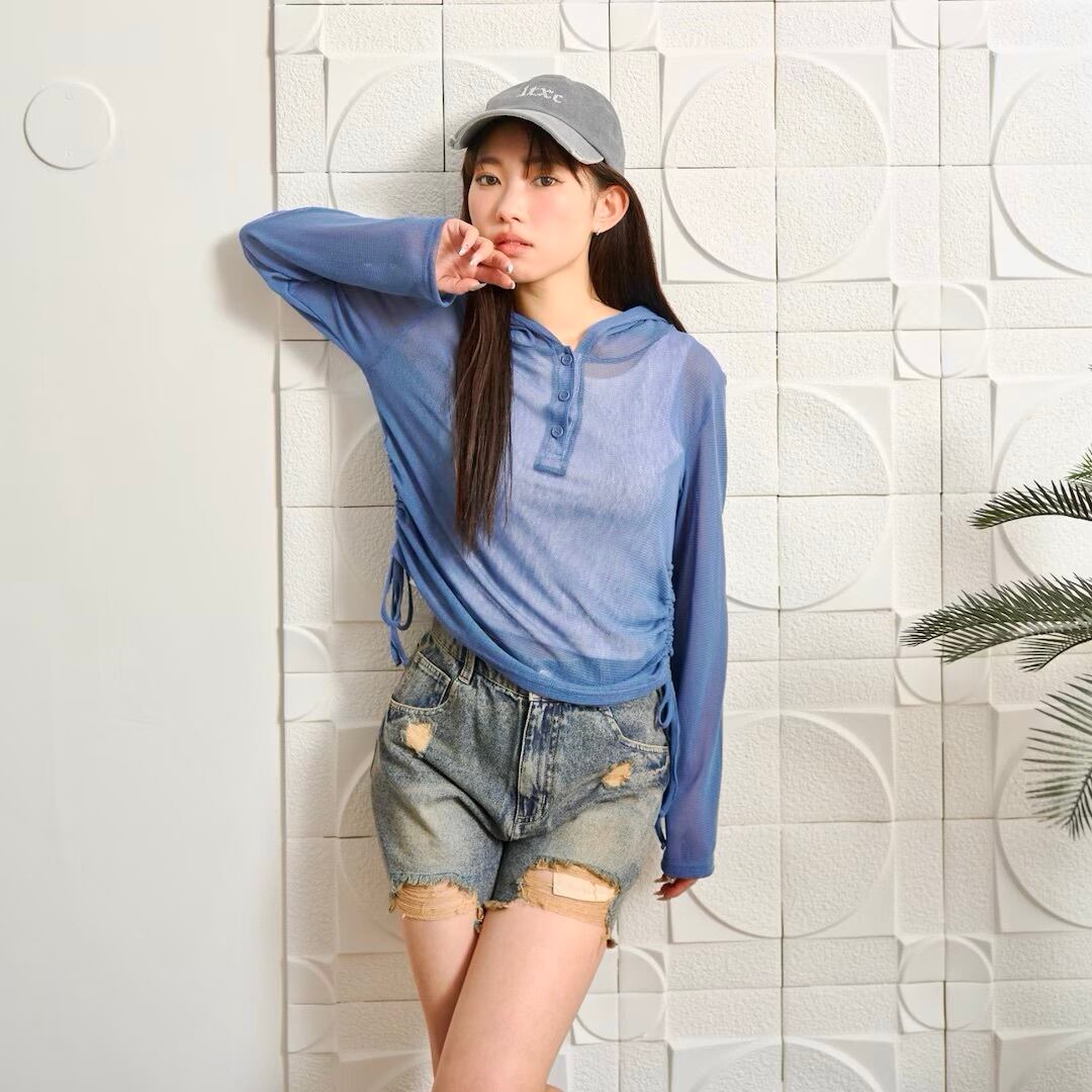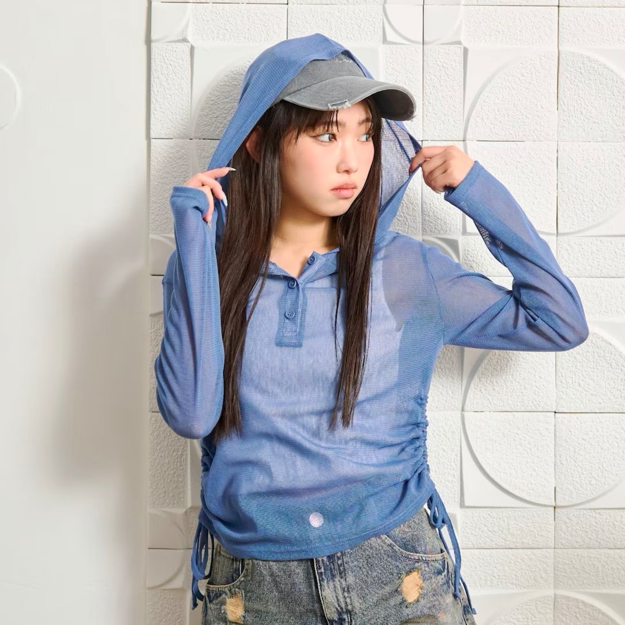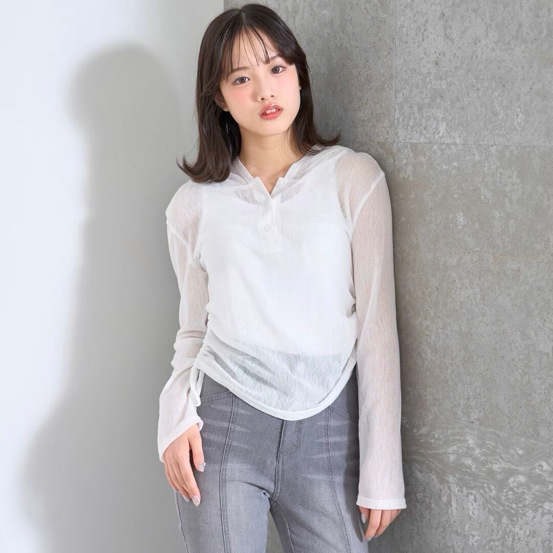 涼しげな透け感がポイントになっているフードつきのシアーニットカットソーです。