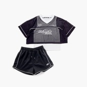 ショート丈トップスとパイピングショーパンがスタイルアップしつつ、普段使いにも活躍。