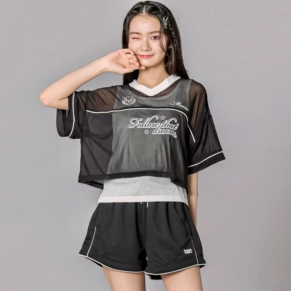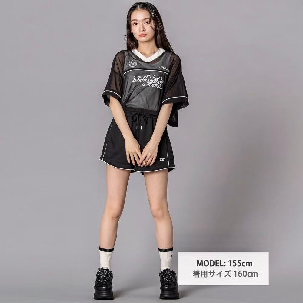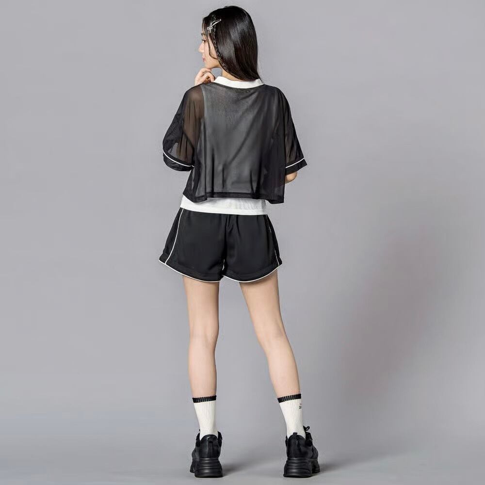 透け感トップス×スポーティショーパンで、春夏らしいグロウスポMIXスタイルが完成。
